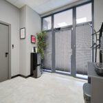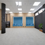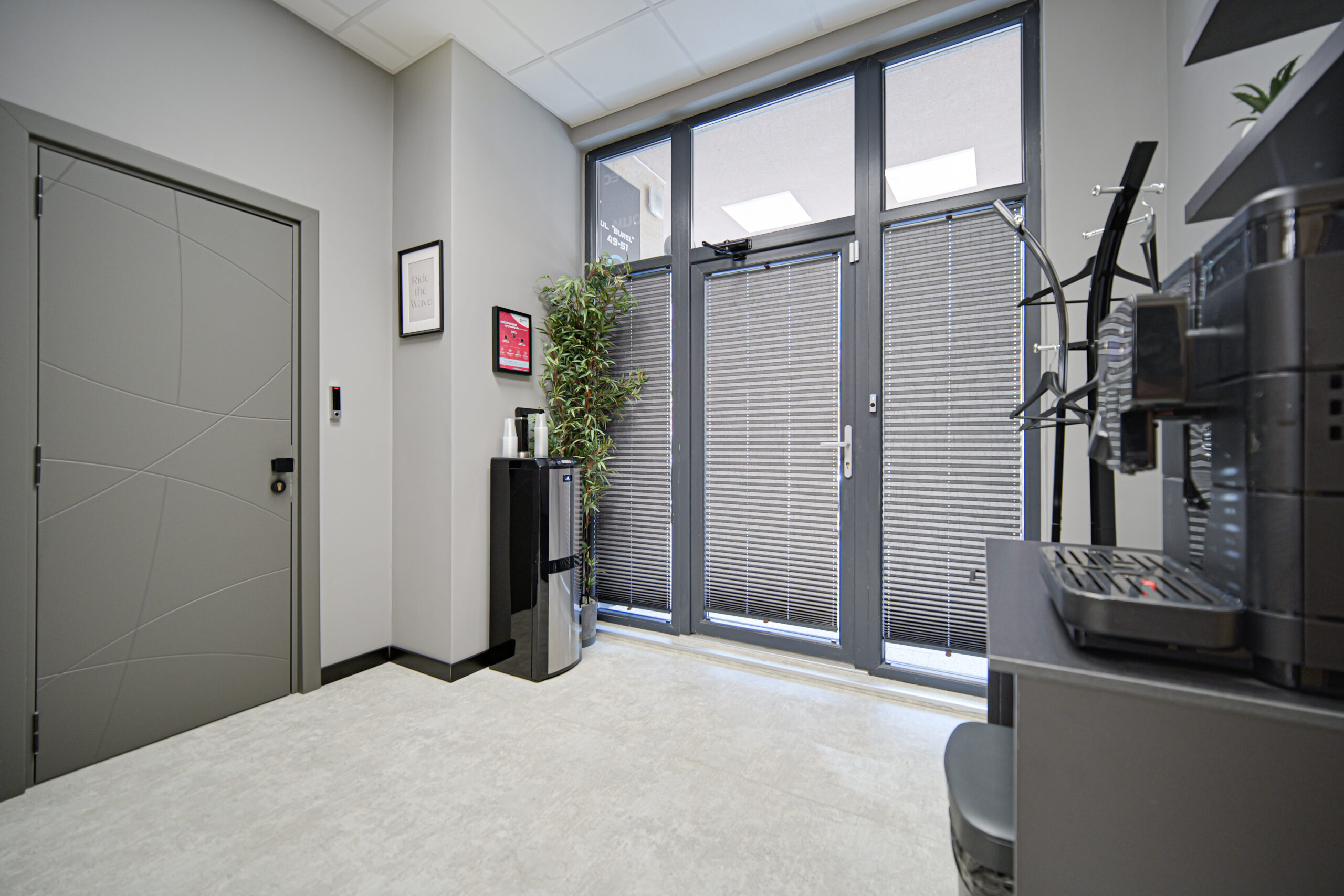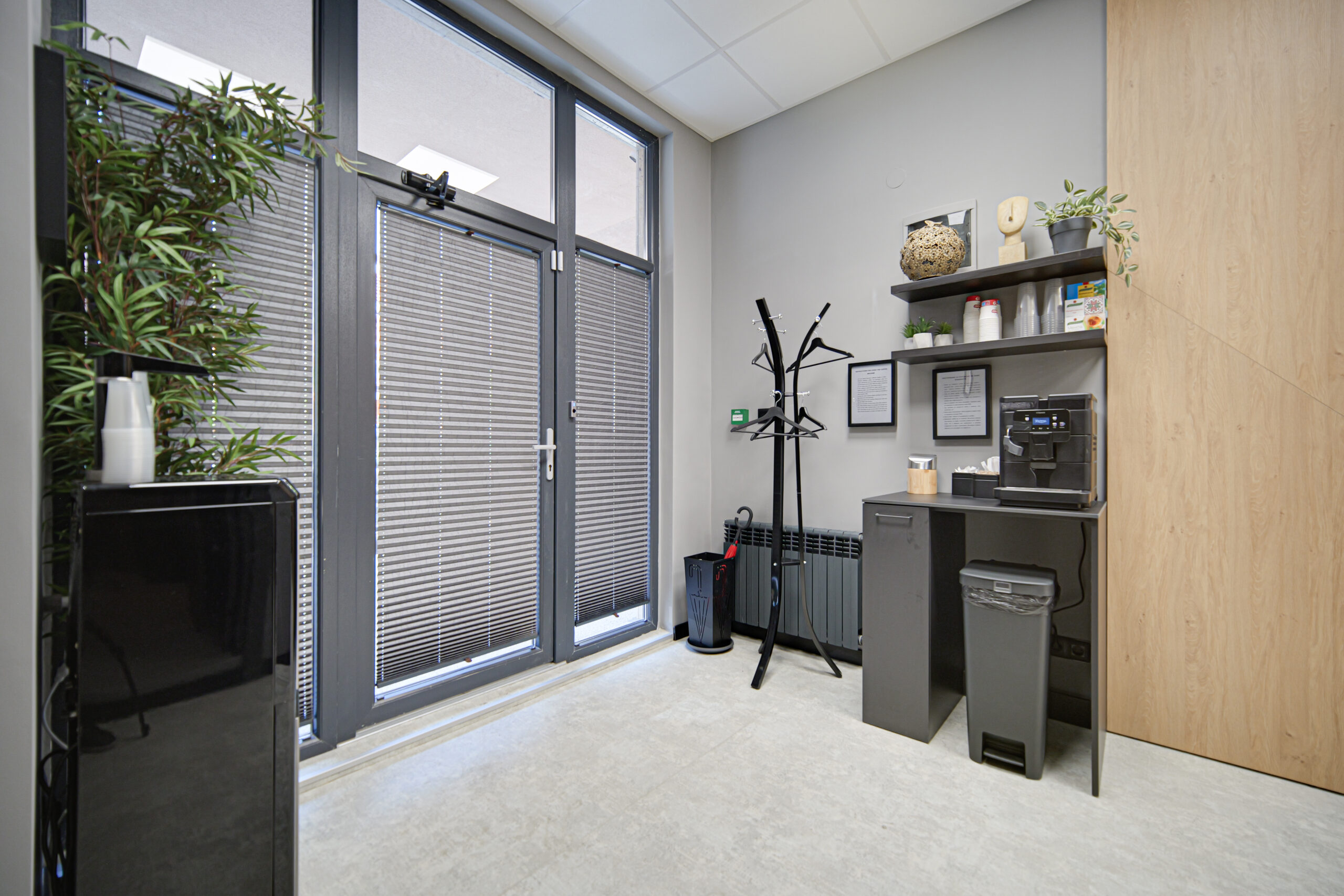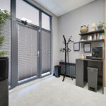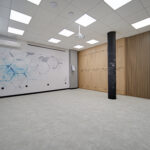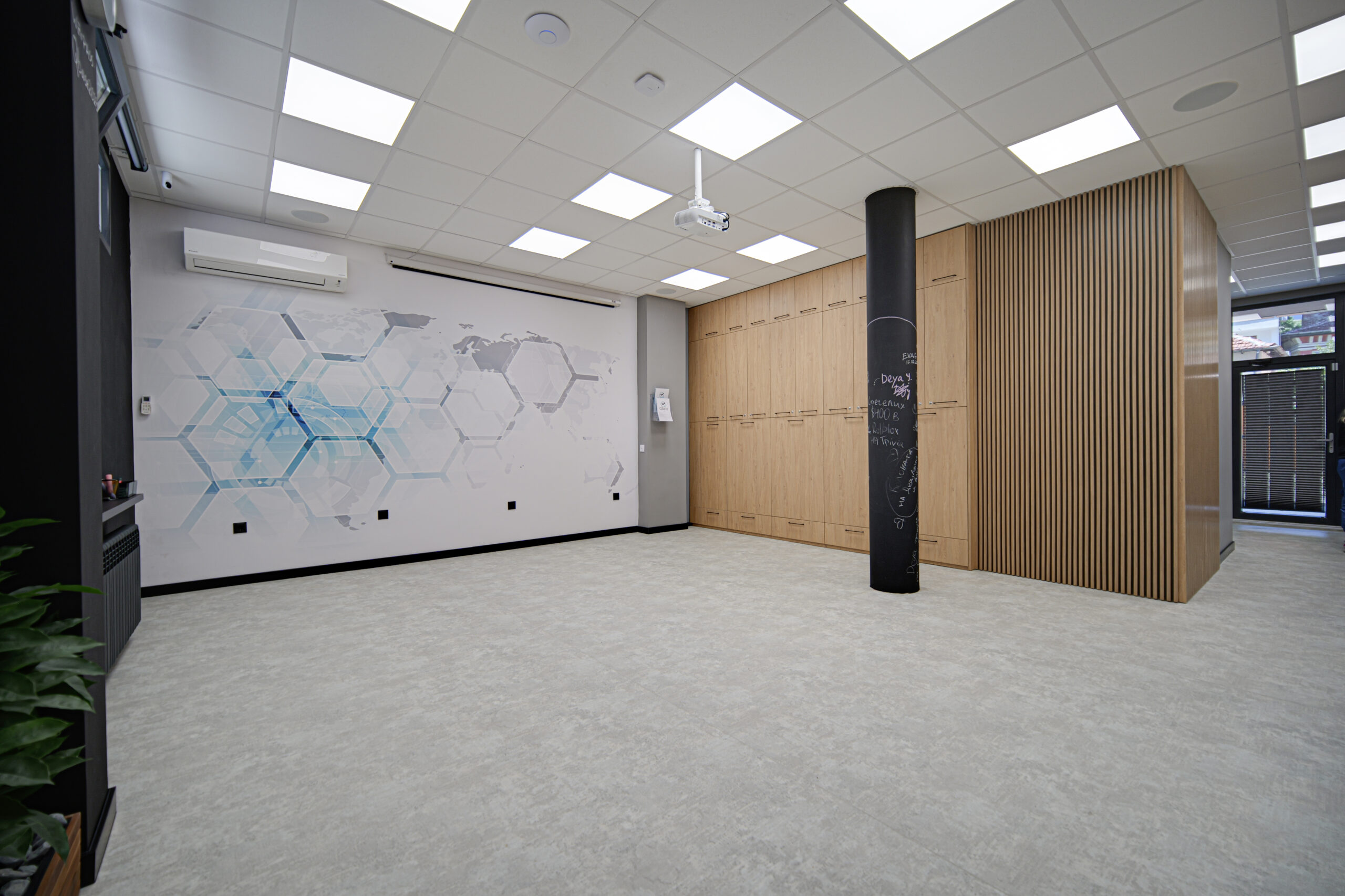 Дизайнът включва PVC дизайнерски под и мебели от естествена дървесина, създаващи усещане за уют, комфорт и професионална работна атмосфера.