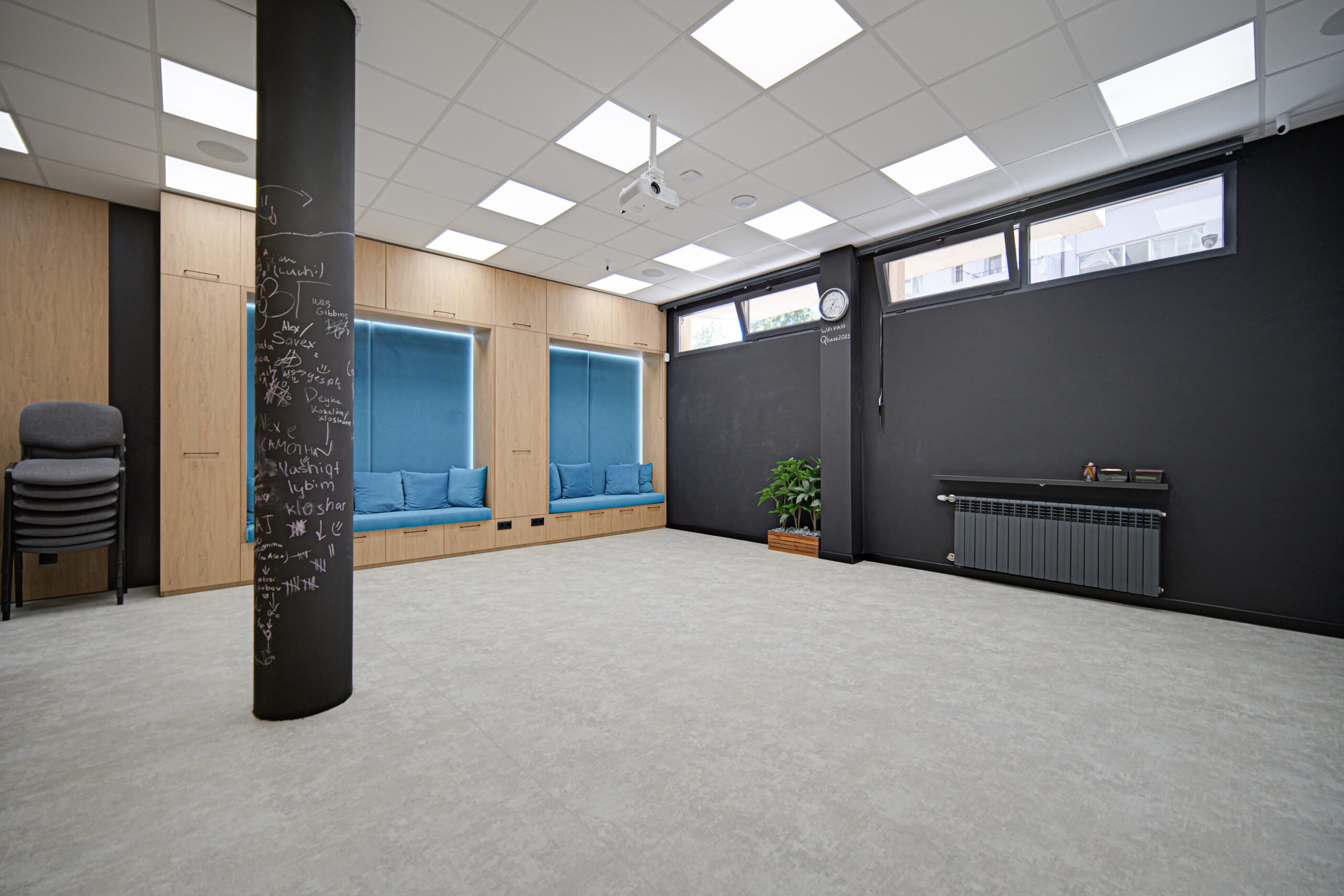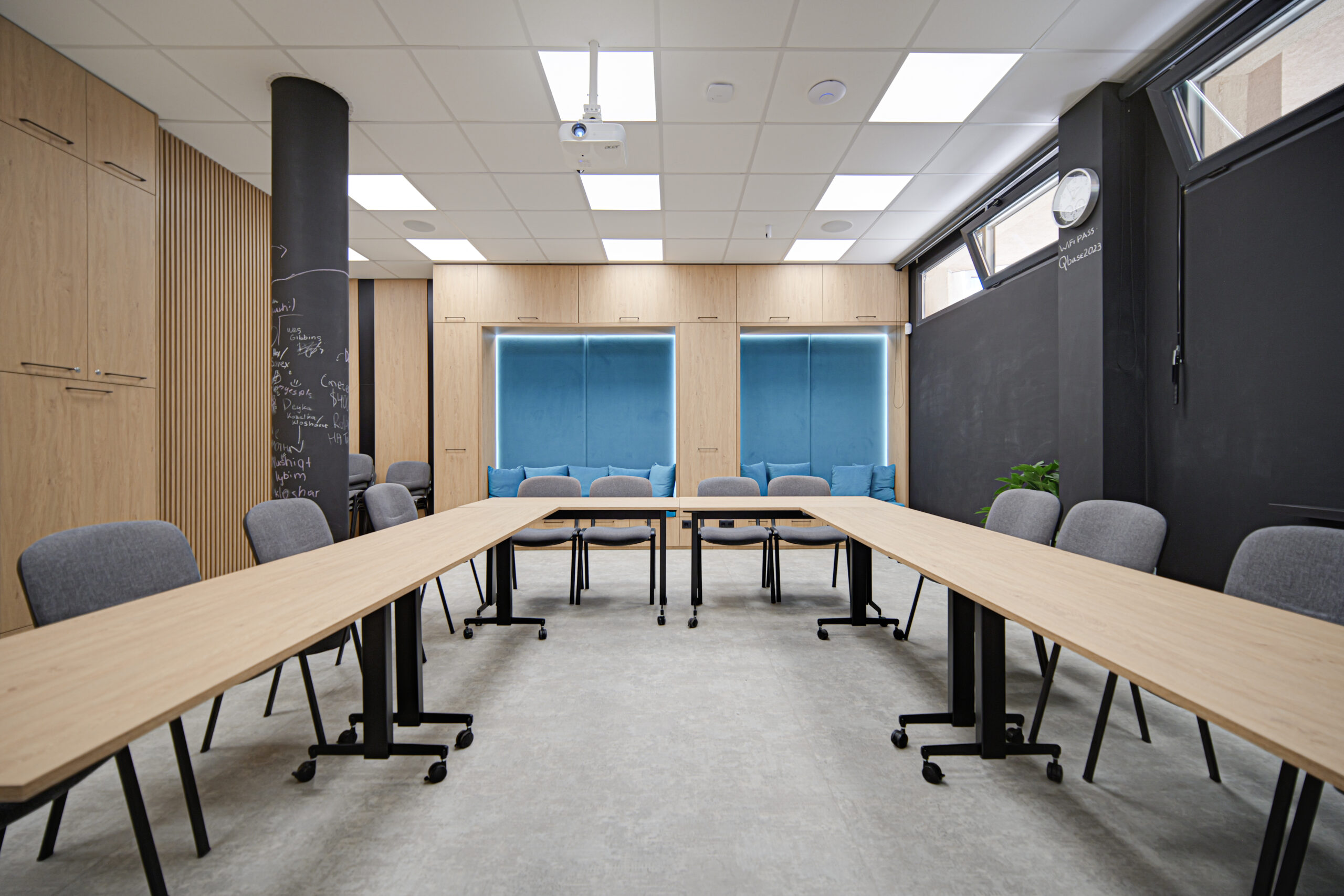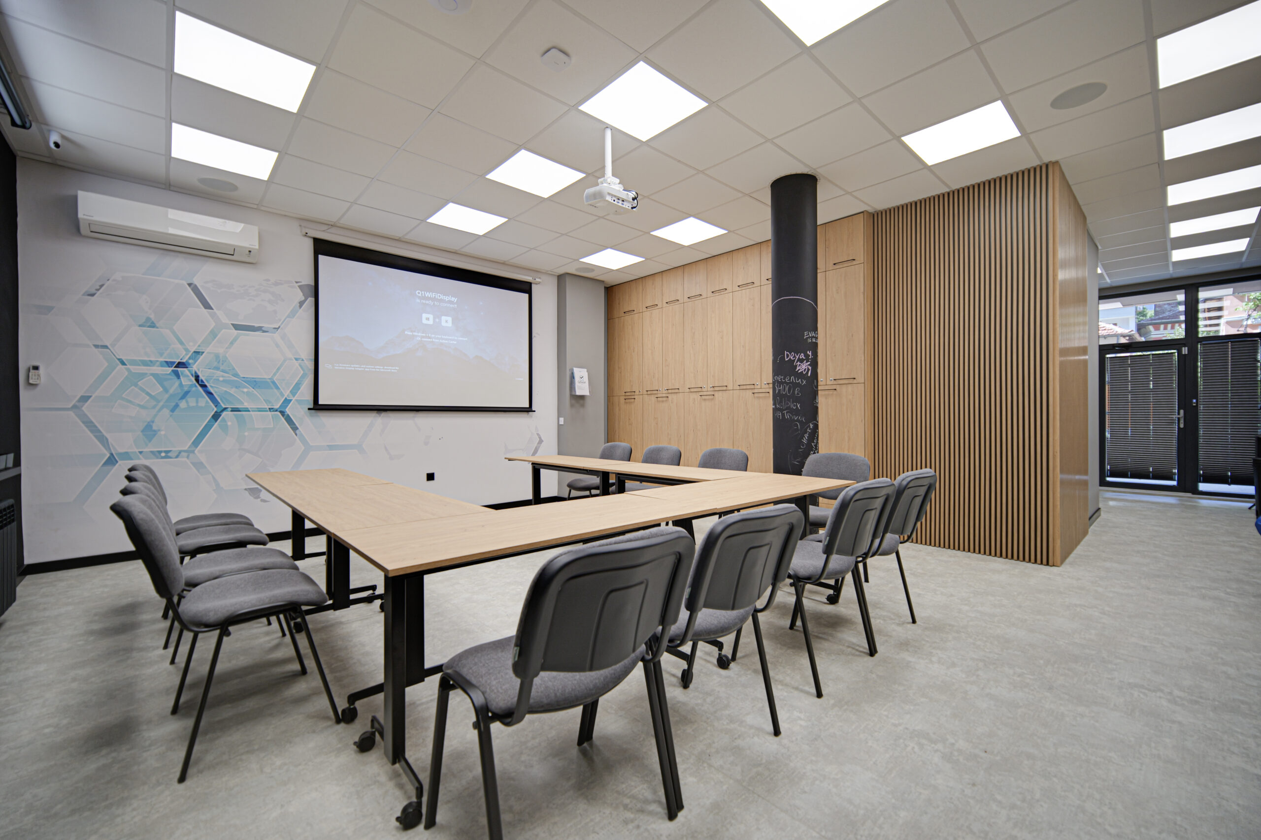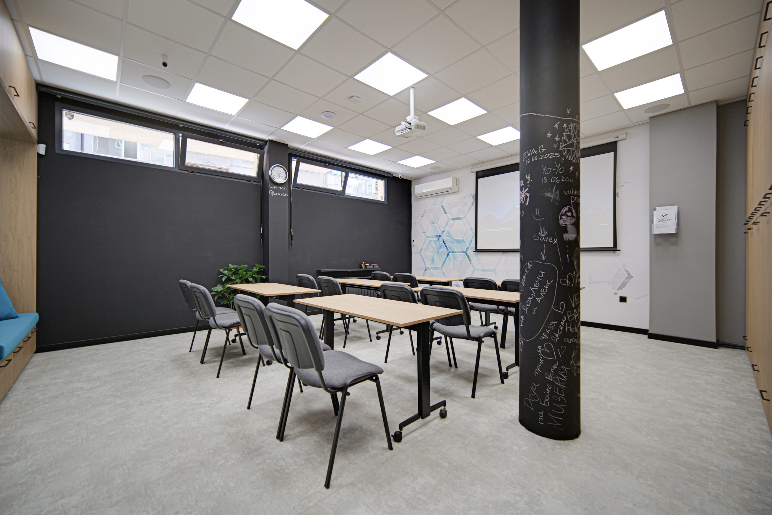 Зала Q1 предлага светло, модерно и изключително функционално пространство, подходящо за корпоративни срещи, обучения, консултации, small team workshops и творчески проекти. Модулната подредба и оборудването осигуряват комфорт и професионална атмосфера за всякакъв тип събития.