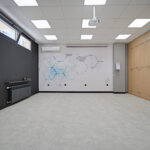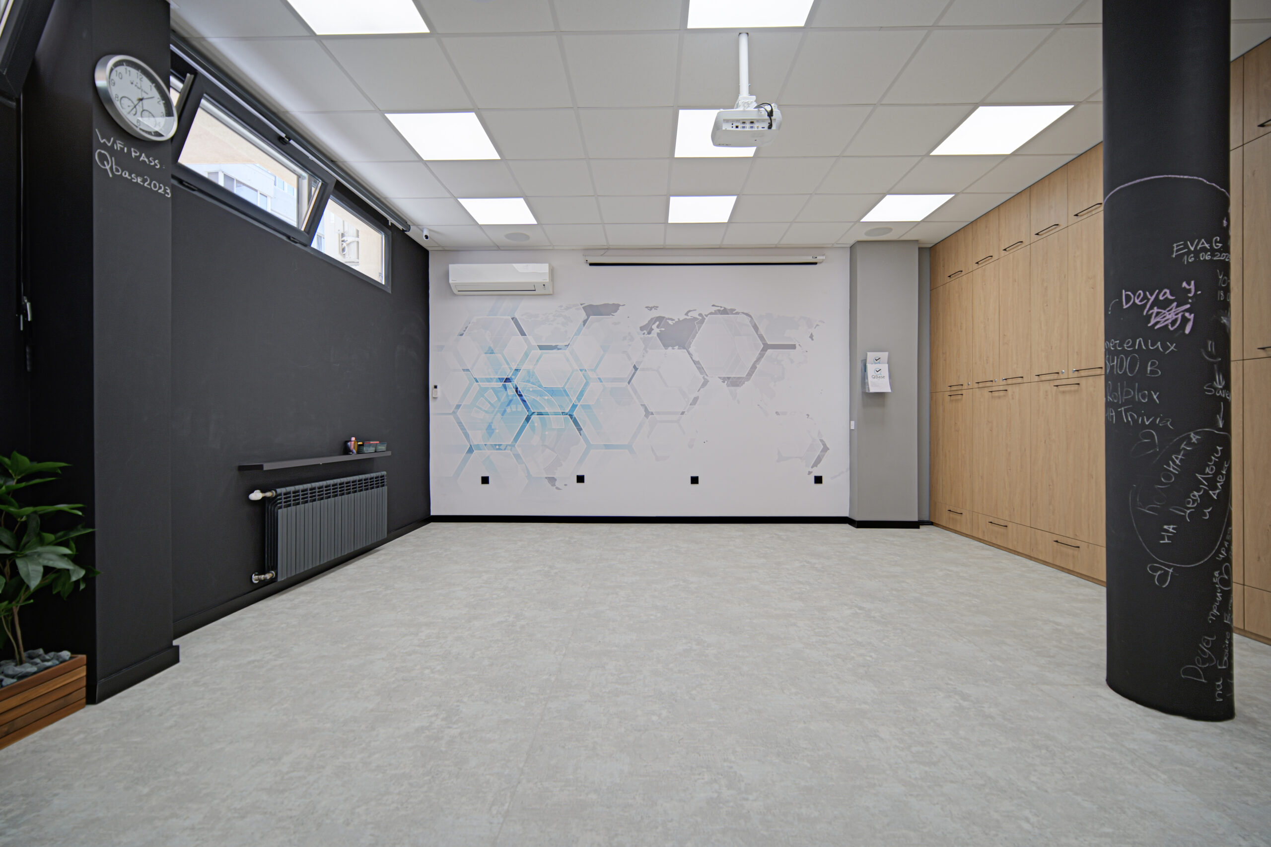 В залата има безжичен интернет, мултимедиен проектор, екран с висока резолюция, Bluetooth високоговорители и цяла стена тип черна дъска.