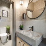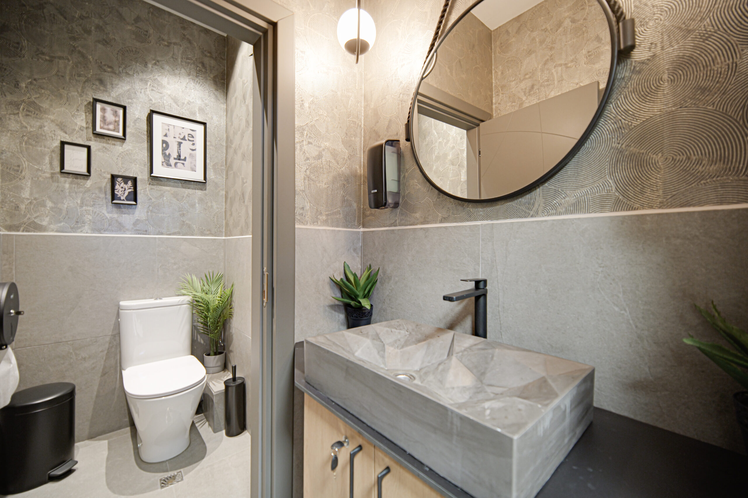 Залата е с уникален интериор в топли и естествени цветове и материали.